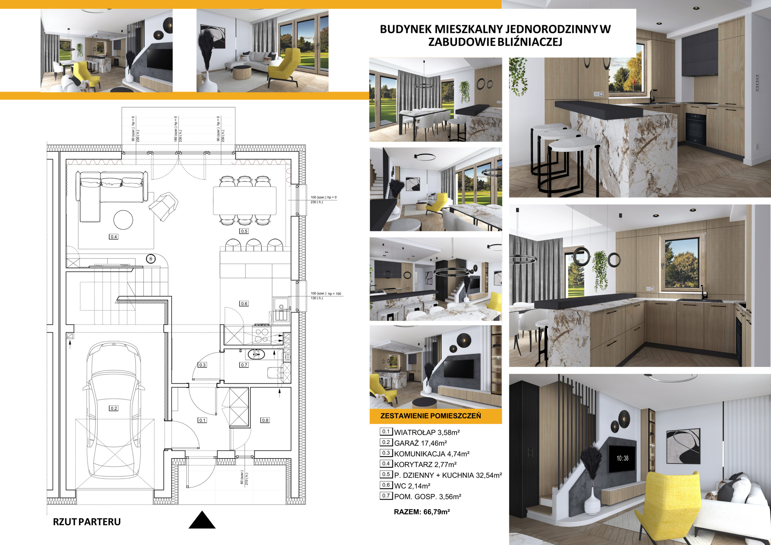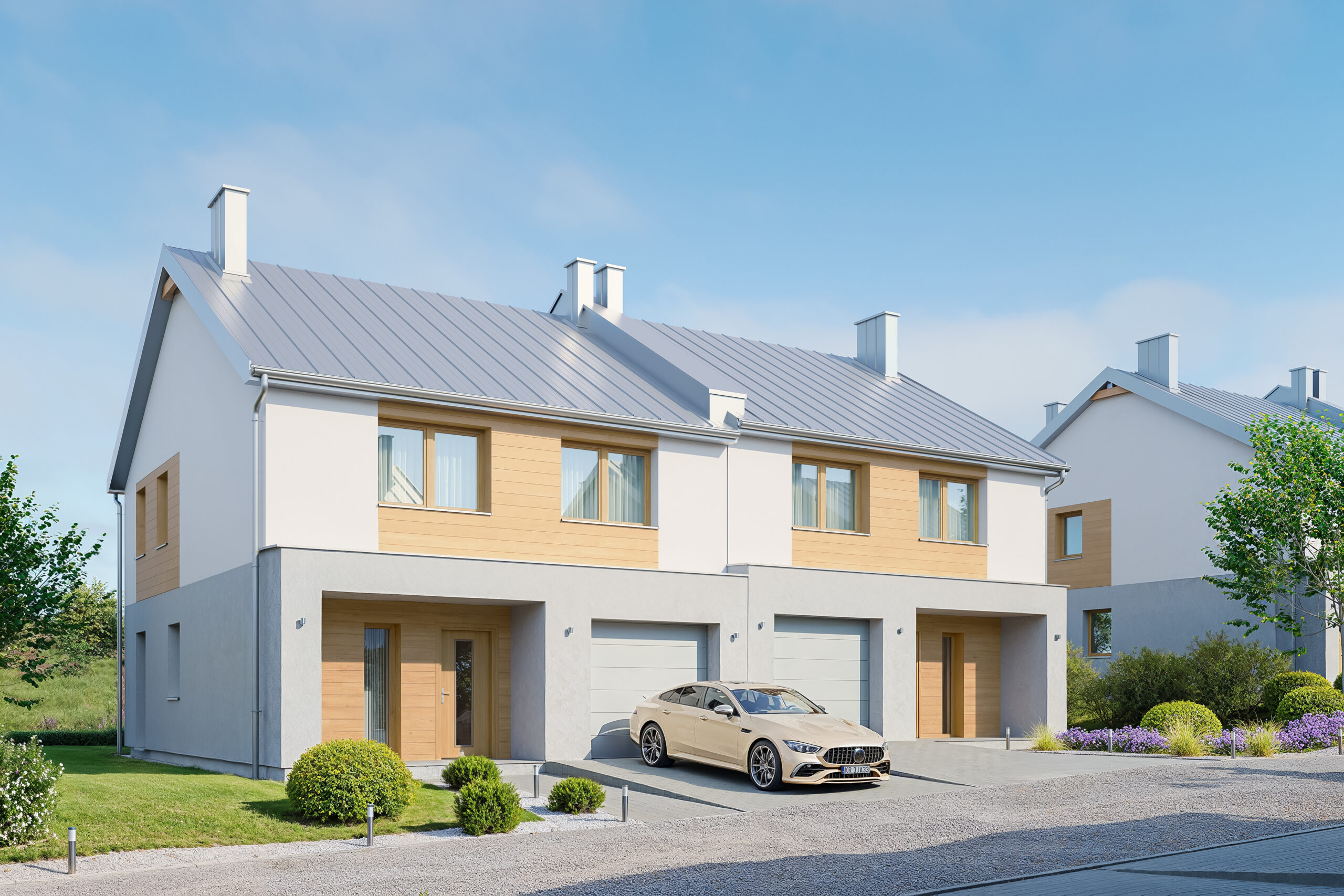 Projekt obejmuje 23 domy w zabudowie bliźniaczej na ogrodzonym terenie z własną drogą dojazdową.